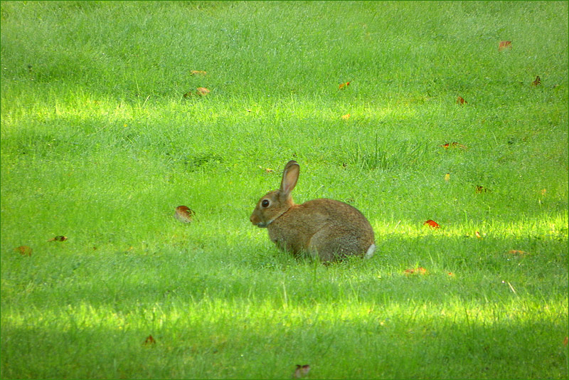 Nach dem schweren Gewitter und Sturm gestern Abend bei uns, war mein erster Gang heute Morgen auf den Balkon, weil dort immer zwei Wildkaninchen sitzen, auf der Wiese. Sie saßen da, und ich war so froh, dass sie sich schützen konnten