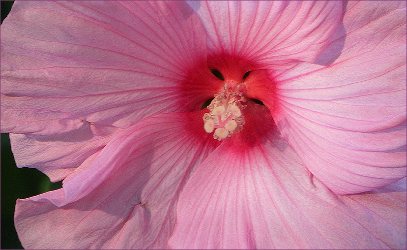 ...ich wundere mich, dass der Hibiscus im Garten blüht, hier gedeiht er nur in Töpfen. Die verschiedenen leuchtenden Farben, so wie dieses Rosa hier, sind einzigartig im Licht...schön auch immer wieder die andersfarbigen Stempel im Inneren, wie zerlaufende Farbe....