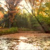 Die hellen Sonnenstrahlen huschen ins dunkle Laub und küssen die Farben wach