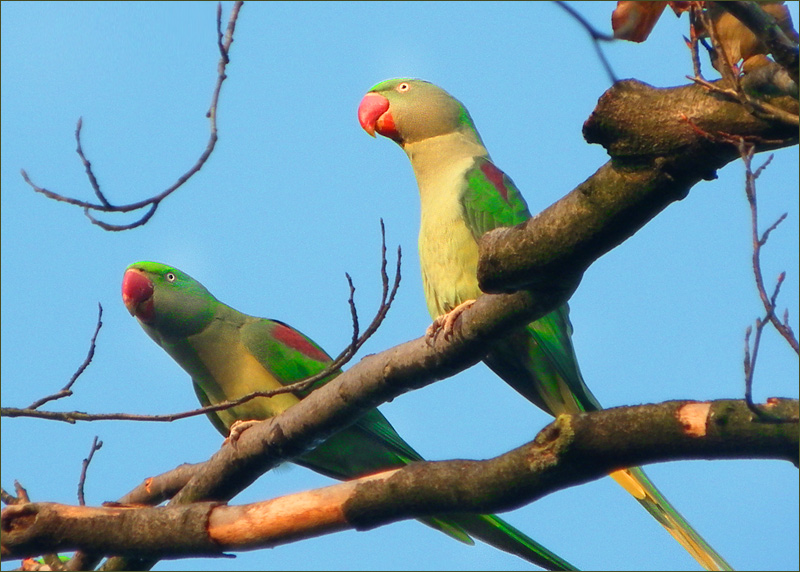 Jetzt habe ich einen Schrecken bekommen. Nicht weil das Bild nicht schön ist, es sogar wunderwunderschön. Aber in der Nacht hatte ich einen Traum, ich sah zwei Papageien auf Ästen sitzen, so wie in diesem Bild und fotografierte sie. Nur der Hintergrund war dunkel und dann die leuchtenden Papageien. Es war noch eine Person da und fotografierte sie auch. Die Person war eher wie ein Schatten. Es wurde kein Wort geredet. Ich erfreute mich an den freilebenden Tieren. Dann erwachte ich aus meinem Traum. Was es manchmal für Zufälle gibt