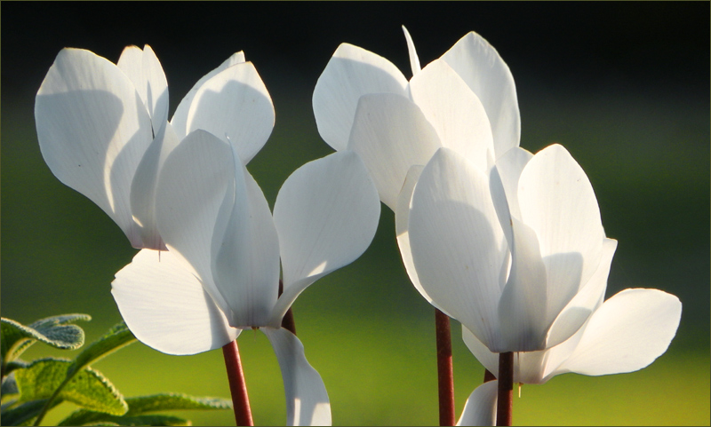 Beim Anblick von Alpenveilchen kann ich meist meine Erinnerungen daran nicht ganz ausschalten. In meiner Kindheit gab es zu festlichen Anlässen oft einen Blumentopf mit Alpenveilchen. (Bei Blumensträußen waren es rosa Nelken.) Weiße waren allerdings nie dabei. Wenn ich mir dieses wundeschöne Foto aber so recht betrachte, zeigen sich mir diese Blüten auf ganz neue Weise ... Für mich ist es ein besonders schönes Foto.