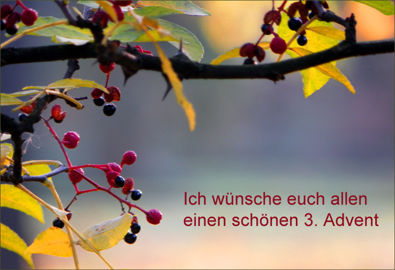 Leider kommen meine Adventsgrüße etwas spät, weil ich keinen Internetzugang hatte, weil ich den Anbieter gewechselt habe. Aber bis Sonntag ist ja noch 3. Advent. Ich wünsche dir, lieber Peter, eine schöne Zeit.