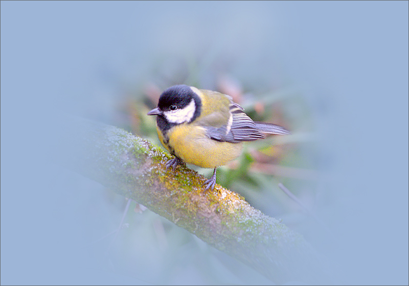 Eine schöne Ansicht der Meise. Mir gefällt die Bearbeitung. Das Hellblau schafft einen angenehmen Fokus auf das Objekt.