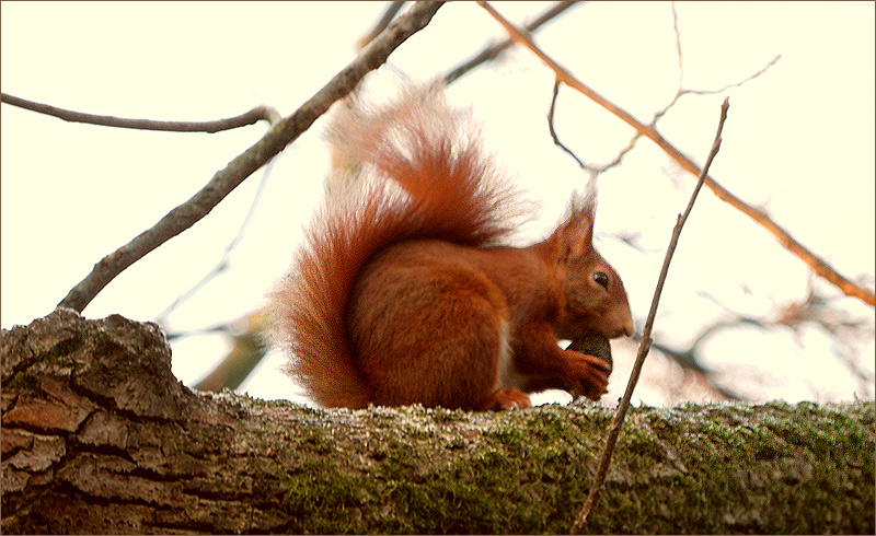 Die Eichhörnchen sind froh, dass Tauwetter ist. Sie kamen ja gar nicht an ihre vergrabenen Nüsse heran, weil der Boden gefroren war.