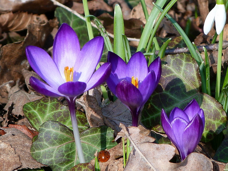.. zauberhaft, liebe Bussi, die drei kräftig lila Blüten, das zarte Schneeglöckchen und dazu noch der Marienkäfer
