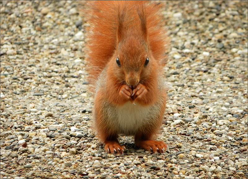 Als würde das Eichhörnchen sich versprühen malt das Kies seine Farbe ins Bild,
