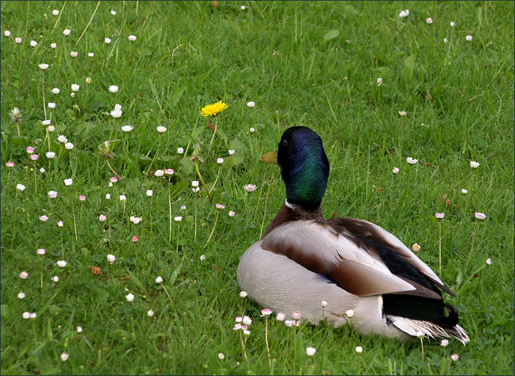 Unter Gänseblümchen und beim Löwenzahn sitzend