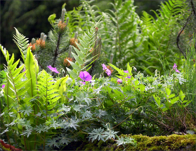 Blüten und Farne in der Morgensonne