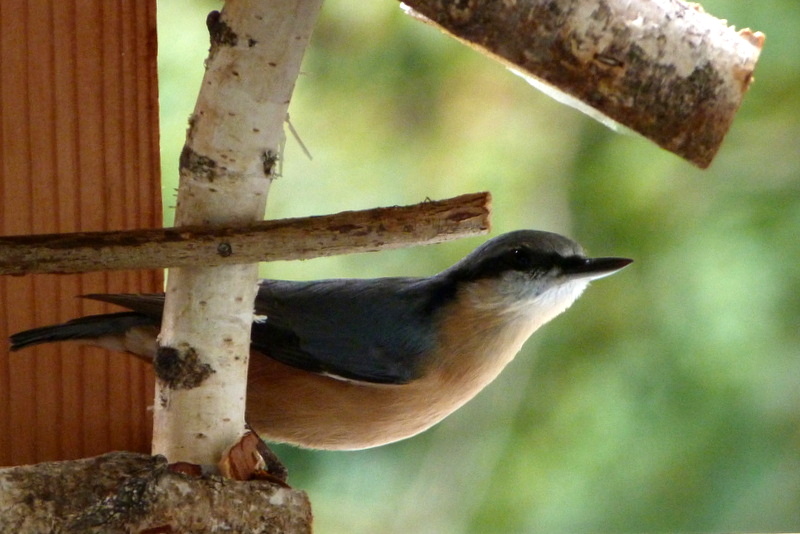 Aus dem Fenster fotografiert. Kleiber und Meisen futtern um die Wette
