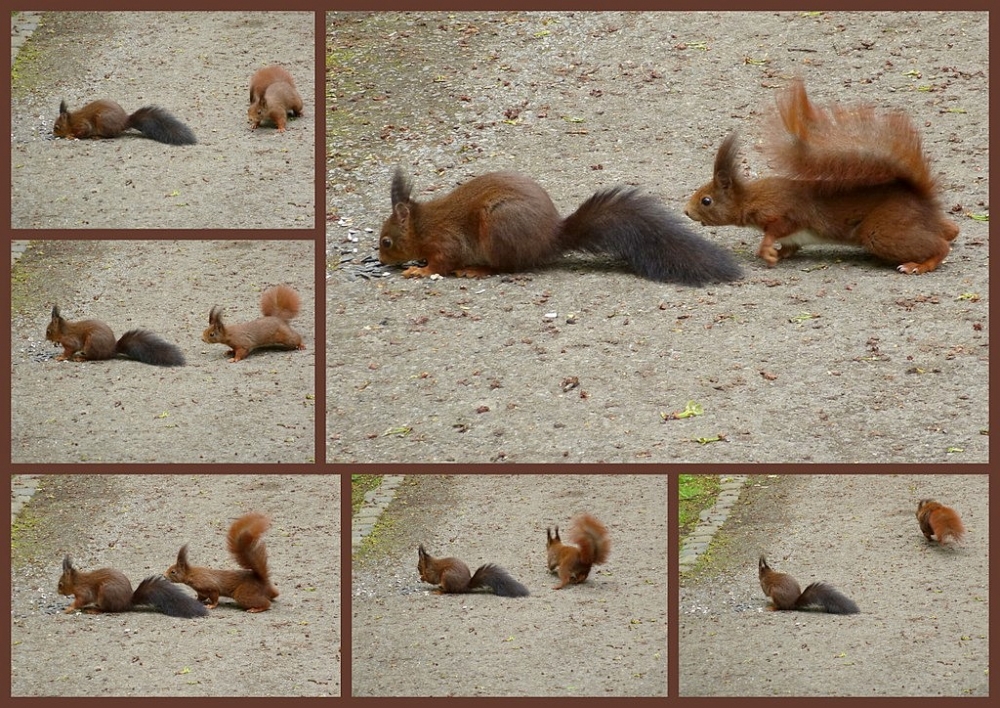 Eine Bildergeschichte über ein Eichhörnchen, das auch von den Sonnenblumenkernen naschen wollte. Das andere Hörnchen hielt es aber davon ab, es wollte nicht teilen