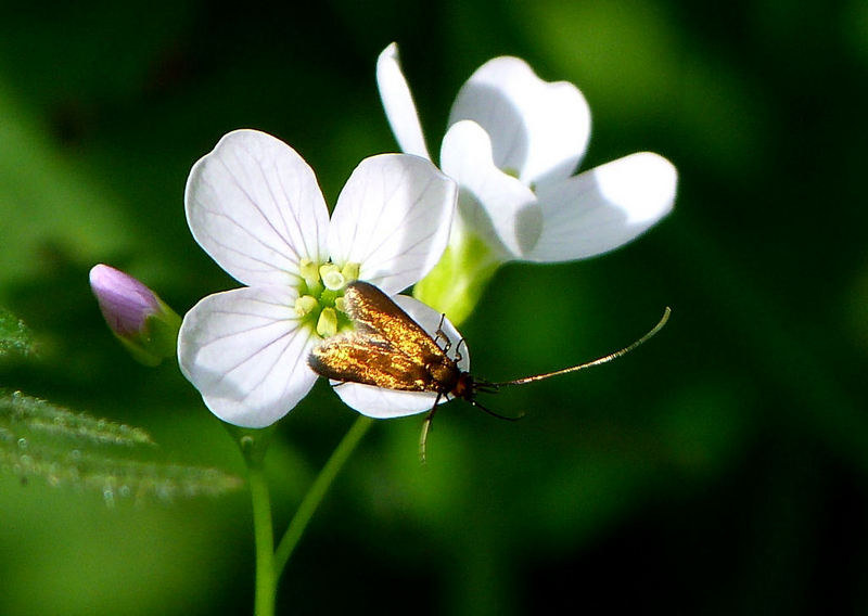 Gesterm bei uns im Wald gesehen. Er fiel mir durch das Leuchten in der Sonne auf. Grüner Langfühler (Adela reaumurella) Sehr klein und häufiger auf sonnenbeschienenen Plätzen ist dieser Schmetterling bei uns im Wald anzutreffen. Er leuchtet in der Sonne und sieht aus, als wäre er mit feinem Goldstaub überzogen.Erwachsene Exemplare von Adela reaumurella erreichen Körperlängen von ungefähr 17 mm.
