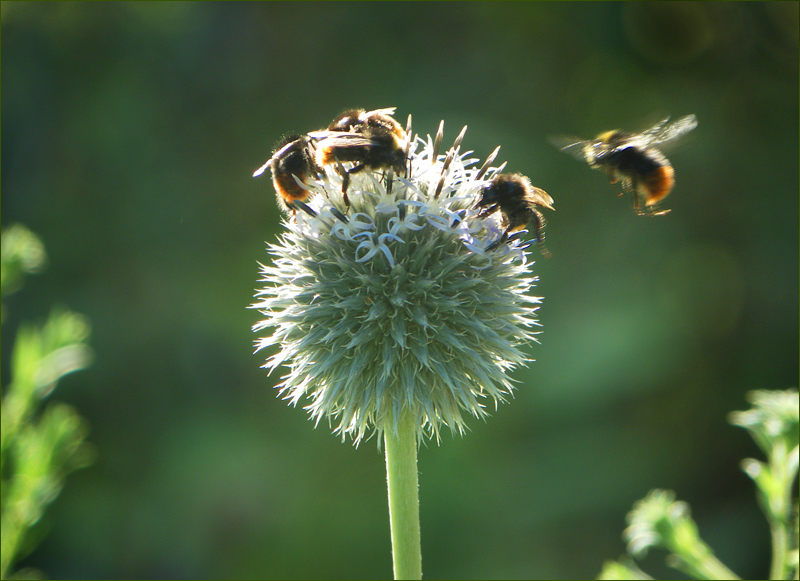 Es macht Freude, ihnen zuzusehen. Jede weiß genau wo sie hinfliegt, alle haben Platz auf der Kugeldistel