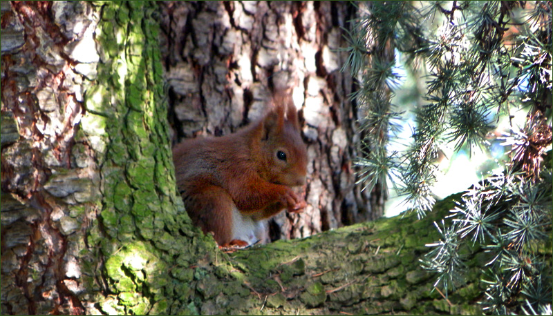 Gestern sah ich so viele Eichhörnchen, sie sind sehr mit ihrem Wintervorrat beschäftigt. Sie sind so flink, dass ich Mühe hatte, sie zu fotografieren. Viele Fotos musste ich löschen, weil ich nur noch den Schwanz erwischte. Wie beschützt es da sein Frühstück knabbert