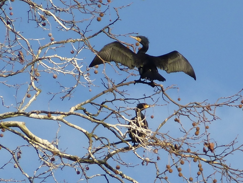 Immer wieder schön zu schauen, wenn sie mit ihren geöffneten Flügeln sitzen, ein schöner Schnappschuss liebe Bussi. Und dazu die Samenkugeln des Baumes ubnd der schöne blaue Himmel