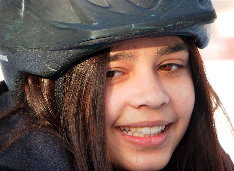 Gesicht eines fröhlichen Mädchens auf der Eisbahn