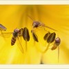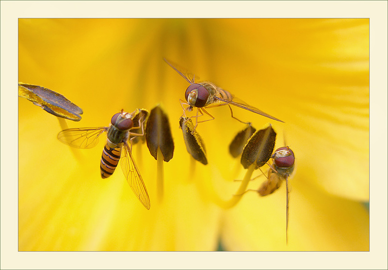 Ein besonderer Glücksfall - drei Schwebefliegen in einer Lilie