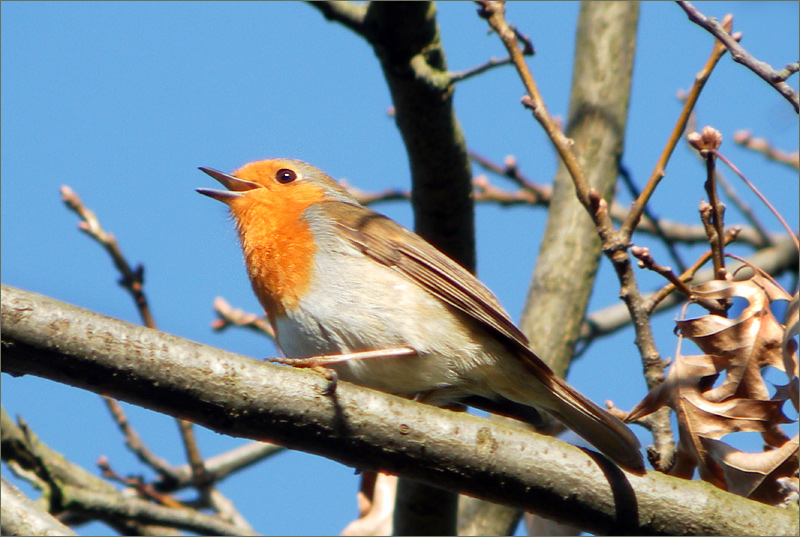 Was für ein zauberhaftes Foto von dem so ganz entspannt im Hier und Jetzt zwitschernden Rotkehlchen, lieber Peter. Ich habe gesucht, wie es singt, hier kann man es kurz hören (und auch sehen):