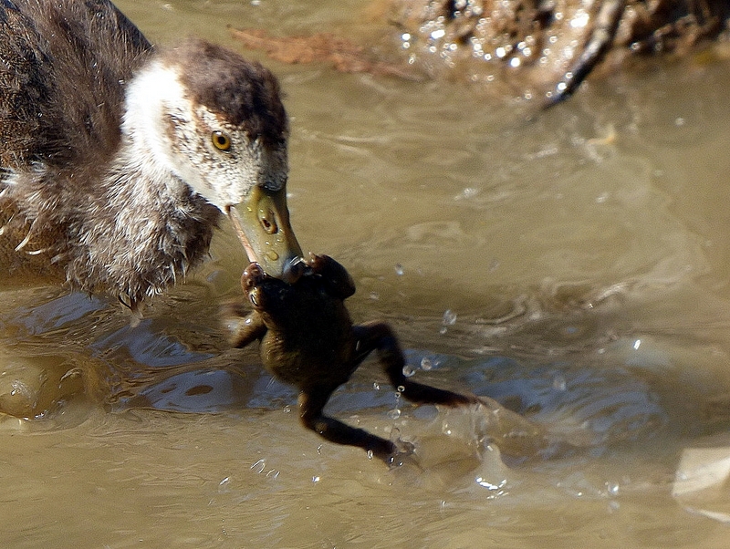 Gefressen hat er ihn nicht. Das sind wohl die ersten Erfahrungen. Ob der Frosch noch lebte, kann ich nicht sagen. Er brachte ihn an eine andere Stelle.
