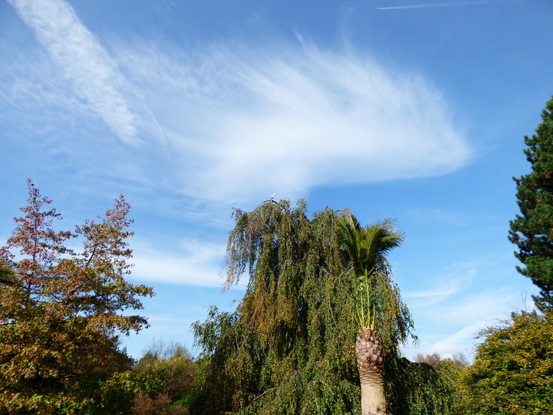 In der Mitte ganz oben im Baum sitzt der Fischreiher vom Foto vorher
