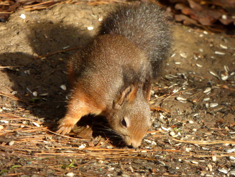 Oben im Baum hing ein Futterautomat für Vögel, das Eichhörnchen futterte was herunter fiel