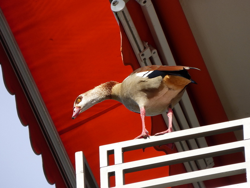 Nilgans auf einem Balkon im dritten Stock