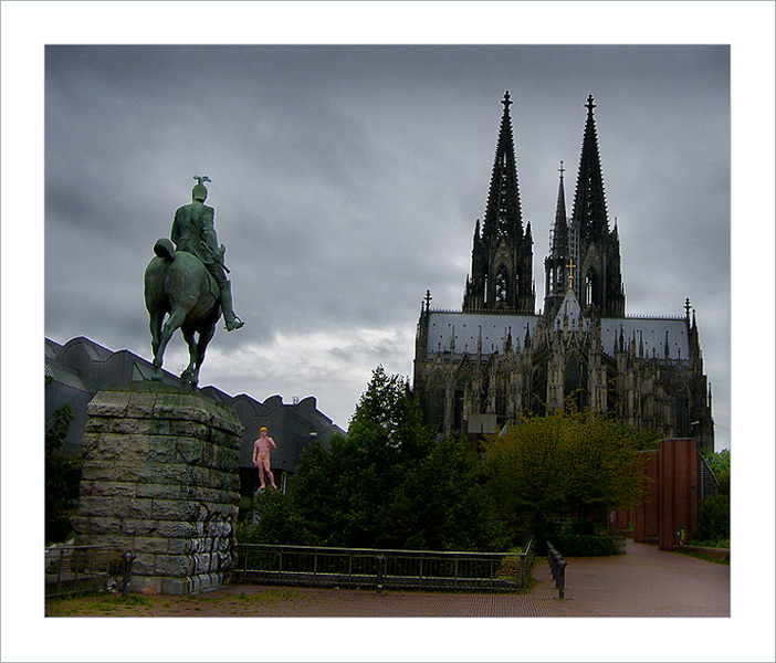 Auf diesem Foto ist das ganze Panorama auf der Rückseite des Kölner Doms erfasst, die Reiterstatue und der rosafarbene PopDavid und der Weg zum Dom Der Himmel war sehr bewölkt, aber gerade das finde ich besonders interessant.