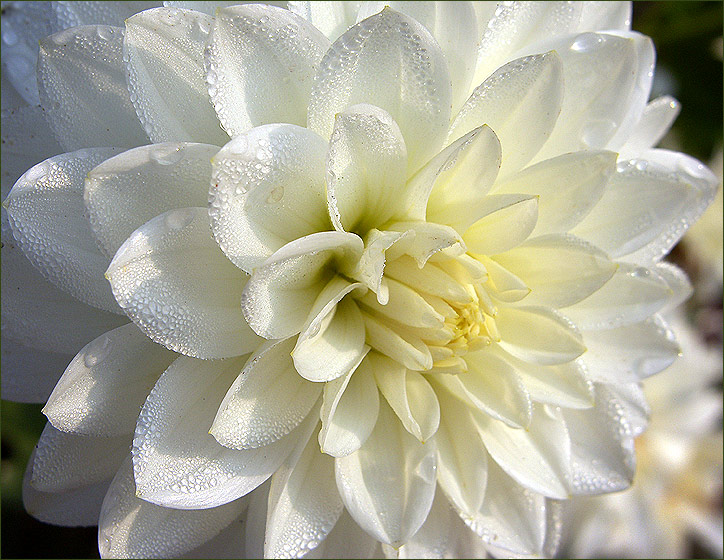 Kleine Tautropfen auf einer weissen Dahlie