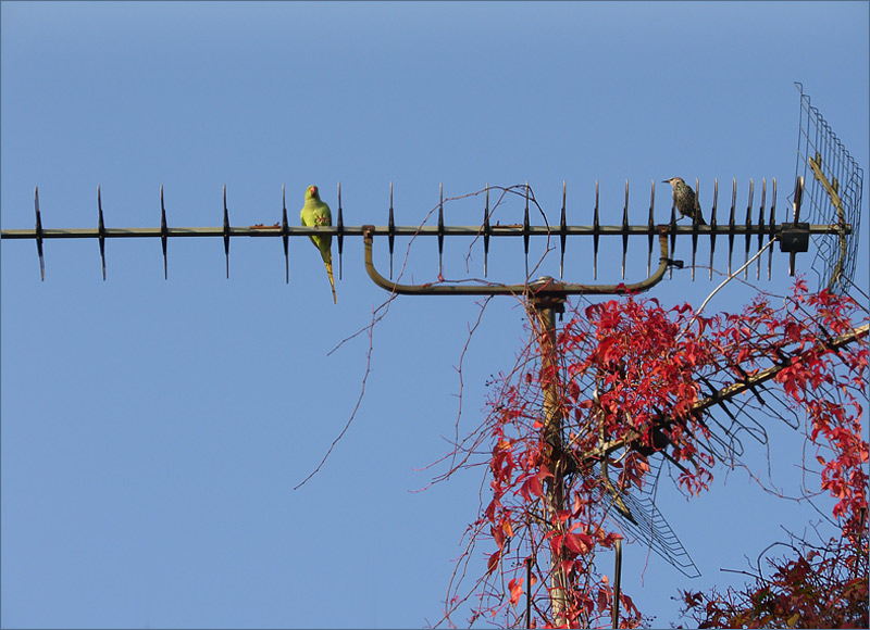Er sitzt auf einer TV-Antenne und ein Star betrachtet ihn neugierig...