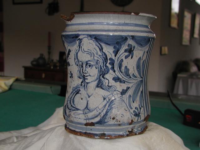 Er ist 18 cm hoch, der Durchmesser beträgt 15 cm.Ich erbte ihn als Frankfurter Milchtopf. Die vollbusige Dame darauf schaut mich immer lächelnd an, wenn ich den Topf anschaue.