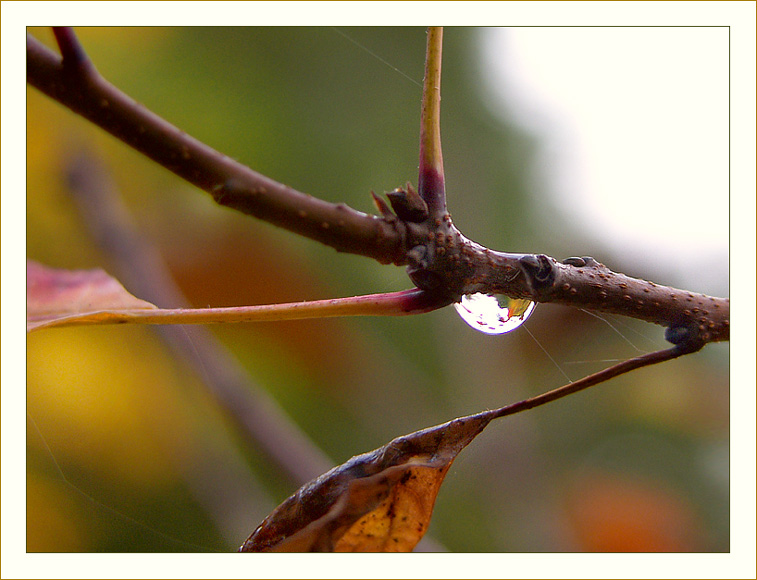 Ich mag vorallem auch die weichen herbstlichen Farben des verwischten Hintergrundes! Und auch in dem Tropfen sind diese Töne nocheinmal zu sehen!