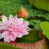Das ist ja eine Riesenseerose, eine Viktoria Regia. Bei uns gibt es sie auch. Ich habe sie aber nur in der Knospe gesehen, den Namen habe ich fotografiert. Wunderschön sehen sie aus, wie aus Krepp.