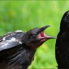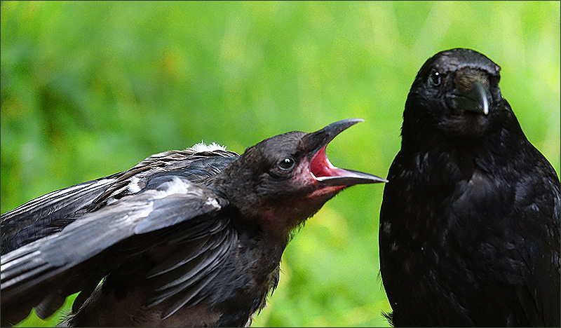Der junge Rabe bettelt bei der Mutter nach Futter, aber er wird von ihr ignoriert und abgewiesen.
