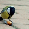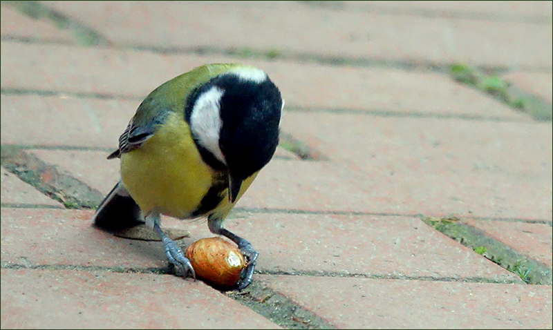Kohlmeise mit einer Haselnuss