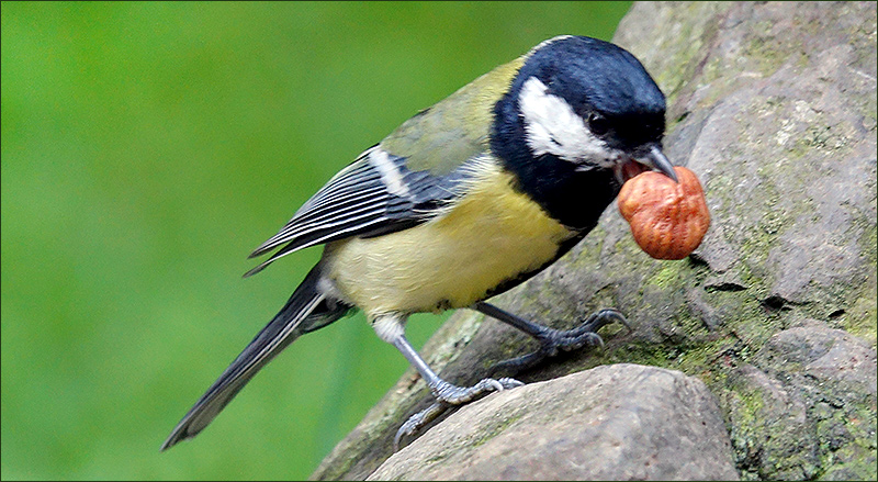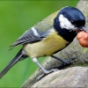 Kohlmeise mit einer Haselnuss