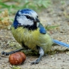 Blaumeise und eine Haselnuss