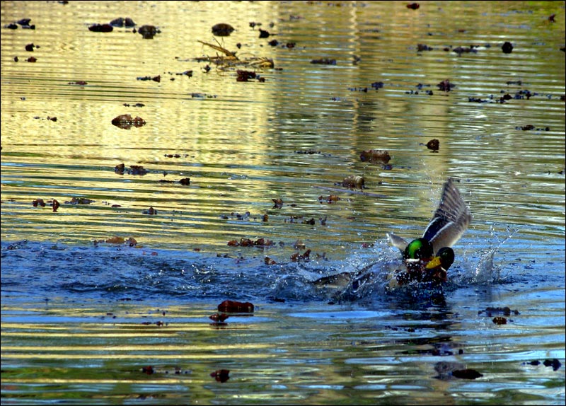 Nur der stärkste Erpel im Rangstreit unter den Erpeln kann das Entenweibchen erobern... so sind die biologischen Naturregeln im Tierreich