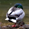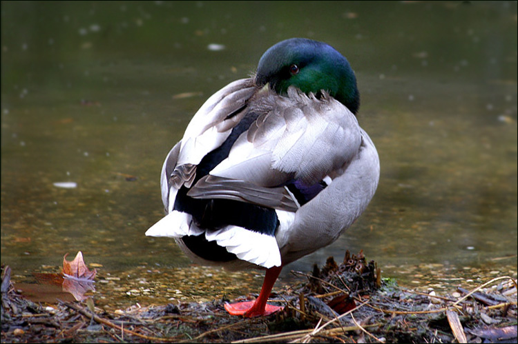In Schlafhaltung mit Kopf ins Gefieder, aber mit einem wachen Auge. Er schläft übrigens auf einem Bein stehend, das andere Bein hat er unter seine Flügel geschoben