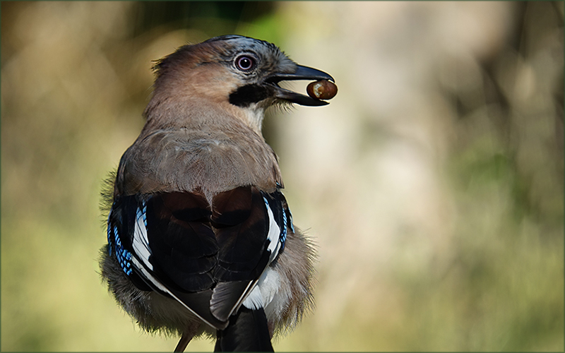 Ein Vogel mit einem Nusskern im Schnabel, erinnert mich daran: Die Schale aufbrechen, um zum Kern vorzudringen. Im Kern der Seele, finden wir alle positiven Eigenschaften wie Liebe, Toleranz, Hilfsbereitschaft u.a. Der Eichelhäher ist ein wenig struppig, aber sehr lebendig. Gut getroffen.