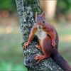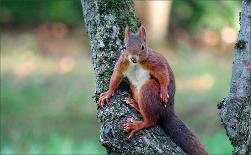 Es scheint, als hätte das Tierchen sich's bequem gemacht um zu schauen was geschieht. Sein Gesichtchen wirkt dabei hellwach und konzentriert. Baumstamm und Eichhörnchen, auf dem es sitzt, kommen vor dem verschwommenen Hintergrund schön zur Geltung. Ruhe und Frieden gehen von dem Bild aus.