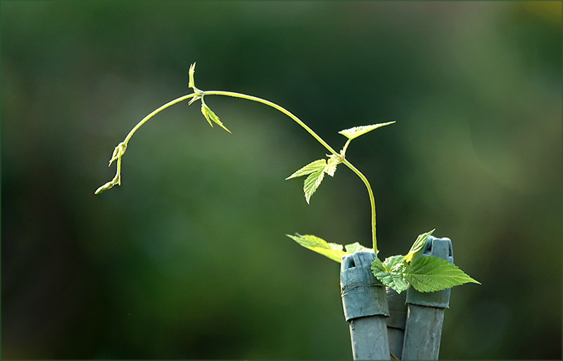 Interessant zu sehen, wie diese Pflanze nach einem Halt sucht um sich daran empor zu winden. Ich hatte einmal so eine Pflanze im Balkonkasten, und als ich ihren biegsamen Stengel einmal mit den Fingern berührte, kam ich aus dem Staunen nicht heraus, ich konnte sehen, wie sich dieses Geschöpf in wenigen Minuten um meinen Finger wickelte. Das sagte mir, dass diese Pflanze ein Empfinden haben musste, denn sie reagierte auf meine Berührung. Ich weiß allerdings nicht mehr den Namen, sie stammte aus einem Samen, der ein Gratisgeschenk zu einem Lebensmittel aus dem Supermarkt war. Ein schönes Bild, die Pflanze strahlt vor dem grünen dunkleren Hintergrund Lebendigkeit aus. Ein Kunstwerk.