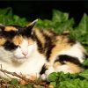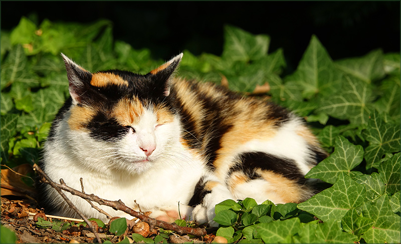 Katzen sind im Grunde genommen friedliebende Tiere. Allerdings, wenn sie ihr Revier verteidigen, können sie anderen Katzen gegenüber sehr aggressiv werden. Ein schönes Bild, die Katze umgeben von Efeu mit einem dunkelen Hintergrund. Ruhe und Frieden gehen von dem Tier aus.