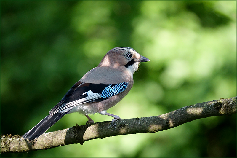 Ja, ein sehr schönes Licht- und Schattenspiel. Der Eichelhäher (wahrscheinlich ein Jungtier), auf dem quer durch das Bild reichenden Ast, macht auf mich einen klugen Eindruck, seinem Blick nach zu urteilen. Sein prächtiges Gefieder kommt in dem einfallenden Sonnenlicht und durch den hellen bis dunkelen Hintergrund schön zur Geltung. Das Bild vermittelt Ruhe und Frieden.