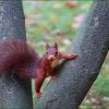 Wie keck es schaut und voller Aufmerksamkeit. Sehr schön getroffen. Die verschwommen schöne herbstliche Wiese im Hintergrund bringt die bläulich grünen Baumstämme mit dem Eichhörnchen darauf schön zur Geltung. Das Tierchen befindet sich in einer interessanten Kletterhaltung.