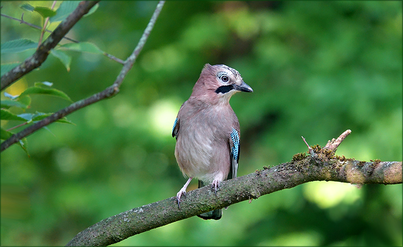 Er schaut sehr aufmerksam der Eichelhäher, sitzt friedlich auf dem Ast, der in der unteren rechten Hälfte durch das Bild reicht. Der grünverschwommene mit helleren und dunkleren Lichtflecken vermischte Hintergrund bringt den Vogel und sein prachtvolles Gefieder schön zur Geltung.