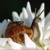 Eine Fliege auf einem Schneckenhäuschen. Ich frage mich, ob die Schnecke das fühlen kann oder ob ihr Häuschen einfach nur aus totem Kalk besteht. Ein gelungener Schnappschuss. Ein schöner Kontrast, dunkeler Hintergrund, davor die weißen Blütenblätter der Dahlie und mitten in der Blüte graubraun bis braun die Schnecke mit der blaugrünen Fliege darauf. Auch schön zu sehen, wie die Schnecke die Fühler ausgestreckt hat.