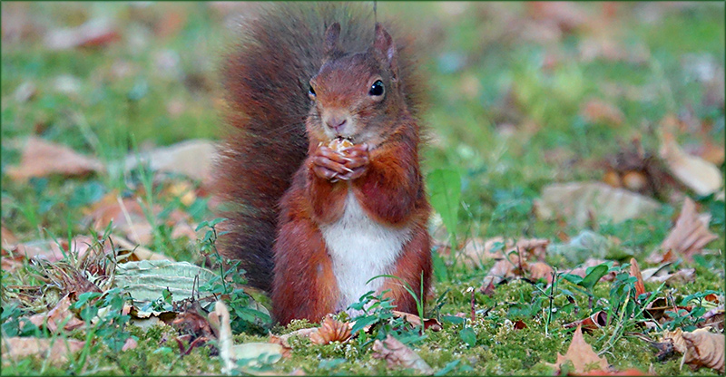 Eine wunderschöne Herbstwiese, und mitten darin das süße knabbernde Eichhörnchen, das Fell sehr schön im Licht schimmernd.