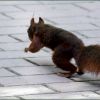 Süß, als wollte es sich leise davonschleichen, vielleicht setzt es auch zum Sprung an. Ein harmonisches Bild, das Grau der Steinplatten mit dem dunkelbläulich grau schimmernden Fell des Eichhörnchens.