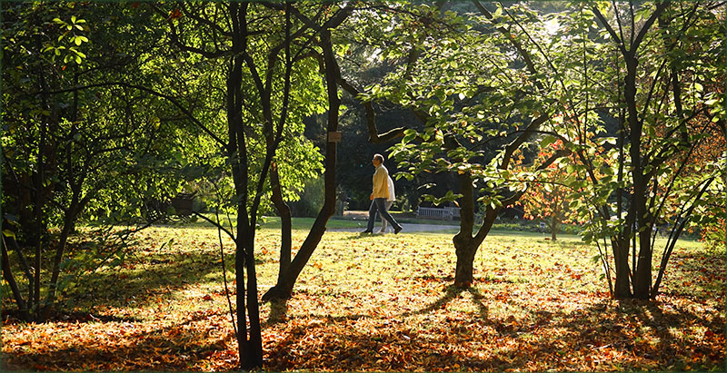 Eine wunderschöne Herbststimmung, mit schönem Licht- Schattenspiel. Ein Spaziergang durch diesen schönen Park, kann Wunder wirken auf die oft so wenig beachtete Seele. Es kommen ja da draußen noch Luft (vielleicht sogar ein leichter Wind) Geräusche und Gerüche hinzu, vielleicht gibt es auch das eine oder andere Tier zu sehen (Vögel, wie Meisen und Halsbandsittiche u.a.), ein Paradies für Körper, Seele und Geist.