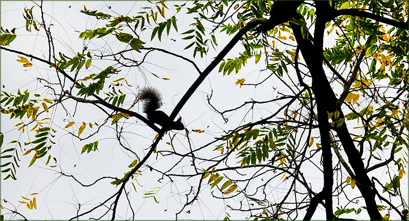 Ein sehr schönes Bild, ein Kunstwerk. Sehr schön zu sehen, wie das Eichhörnchen ausholt zum Sprung auf einen der Äste gegenüber. Auch sehr schön die Herbstlichkeit zu erkennen.