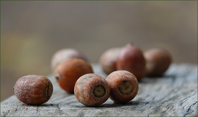 zählen Eicheln zu den Nussgewächsen? Vom Aufbau her würde ich das sagen. Ich habe als kleiner Junge mal probiert wie Eicheln schmecken, ich erinnere mich, dass sie zwar nussig, aber sehr bitter waren. Das Bild finde ich sehr schön, diesen leicht bläulichen Grauton des Steines mit den Nüssen/Eicheln darauf und dem etwas dunkleren Hintergrund.